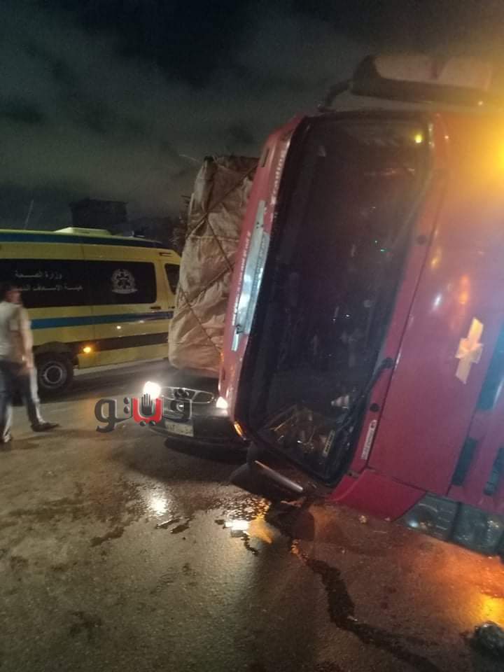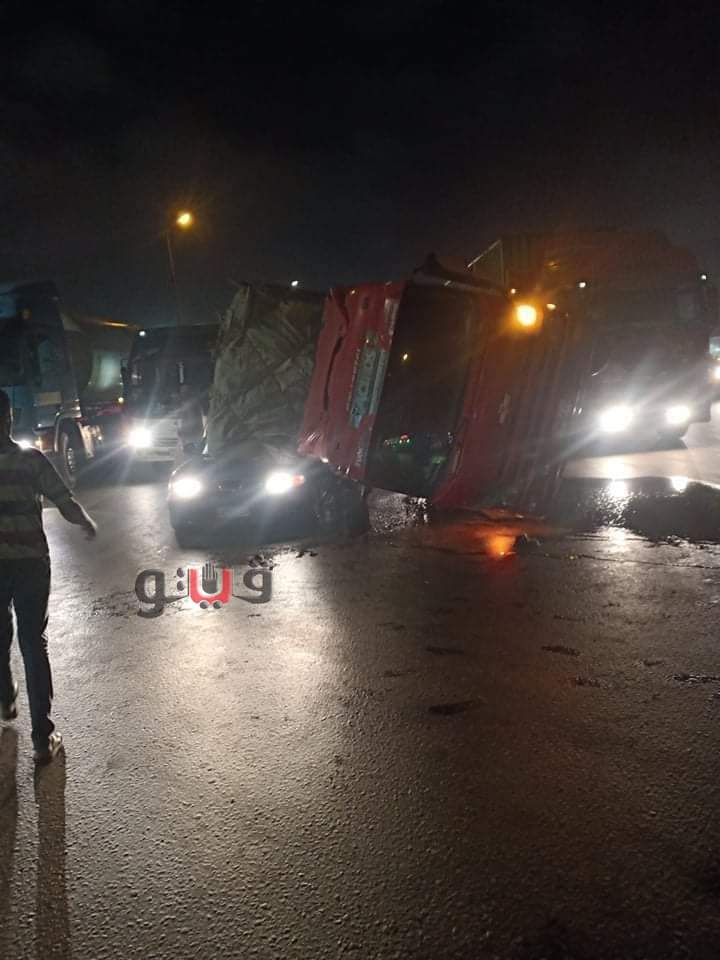 إصابة ٣ أشخاص في انقلاب حمولة سيارة نقل على سيارتين بصحراوي الإسكندرية | صور