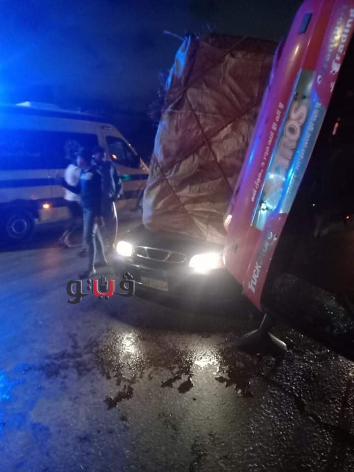 أصيب ٣ أشخاص في حادث انقلاب حمولة سيارة نقل على سيارتين كانتا تمر بجوارها بمنطقة الكافوري على الطريق الصحراوي، غرب محافظة الإسكندرية.