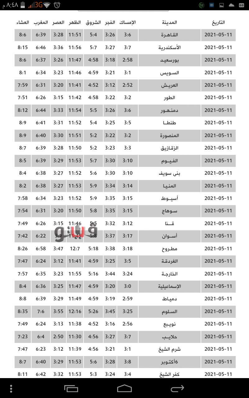 ويوضح الجدول مواقيت الصلاة اليوم كالتالي: