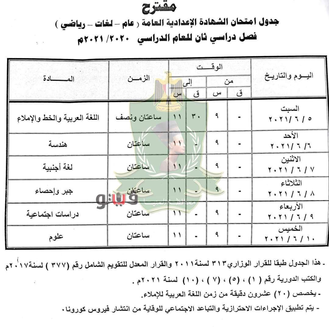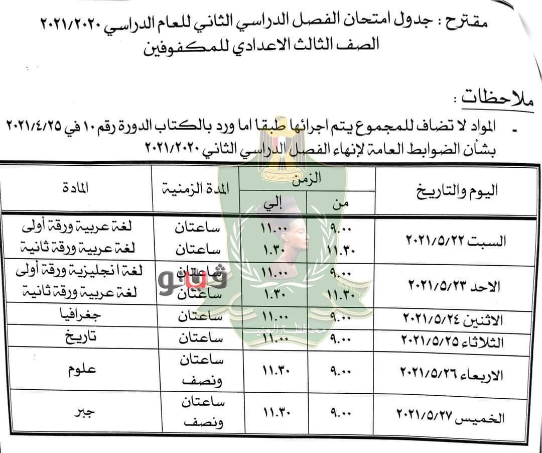 حصلت "فيتو" على نسخ ضوئية لجدول امتحانات الشهادة الإعدادية بمحافظة المنيا لعام 2020-2021 لهذا العام.