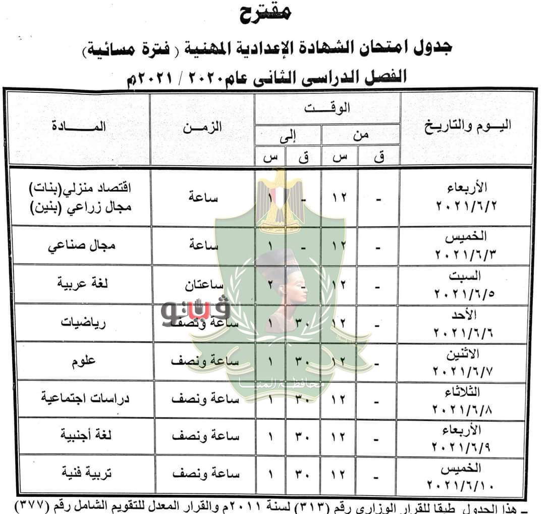 جدول امتحانات الشهادة الإعدادية بالمنيا