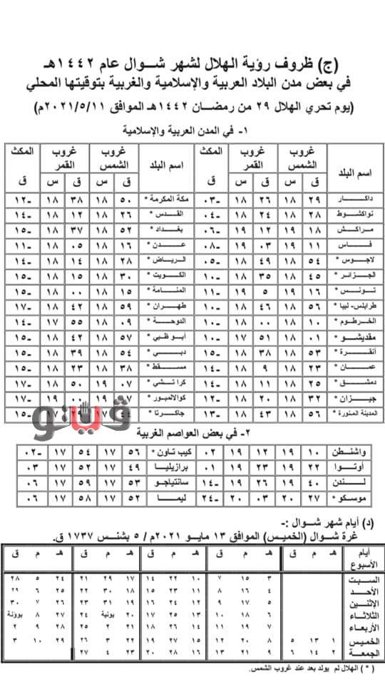 وتكون غرة شهـر شوال 1442هـ فلكياً يوم الخميـس 13 /5/ 2021م (عيد الفطر المبارك).