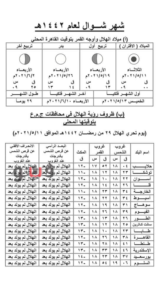 علوم الفلك والمتحدث الاعلامى للمعهد القومى للبحوث الفلكية والجيوفيزياقية ، أن هلال شهر شوال يولد مباشرة بعد حدوث الاقتران في الساعة التاسعة مساءً بتوقيت القاهرة المحلي يوم الثلاثاء 29 من رمضان 1442هـ