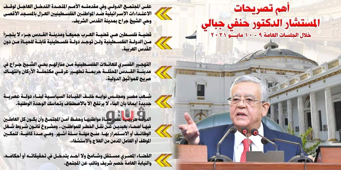 ألقى المستشار الدكتور حنفى جبالى رئيس مجلس النواب بياناً بشأن اعتداء سلطات الاحتلال الإسرائيلي ضد المواطنين الفلسطينيين العزل بالمسجد الأقصى وحى الشيخ جراح بمدينة القدس، مؤكداً أن مجلس النواب المصرى المعبر عن ضمير الأمة يرقب عن كثب الأحداث الدامية التي يعيشها أشقاؤنا في فلسطين، والتى تعد جريمة تطهير عرقى مكتملة الأركان فى انتهاك صريح للمواثيق والقرارات الدولية.
