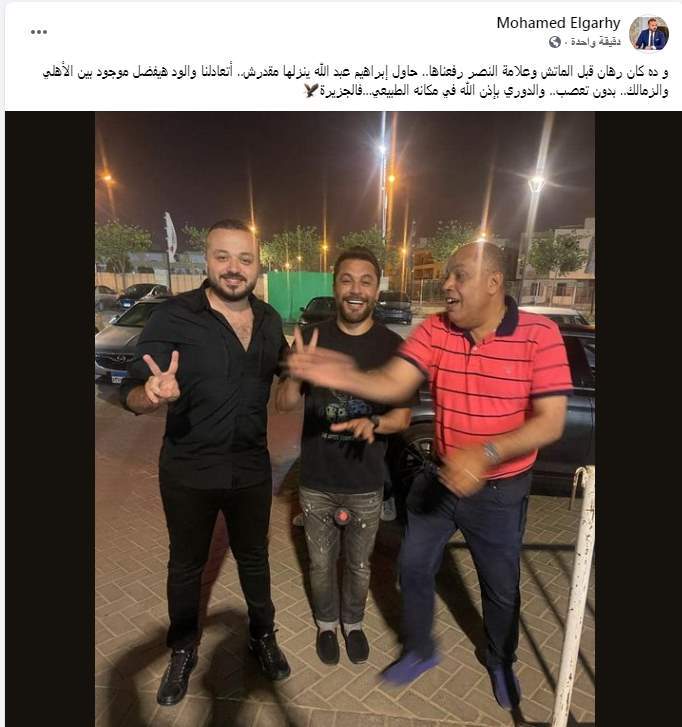وعلق الجارحي على الصورة قائلاً: " و ده كان رهان قبل الماتش وعلامة النصر رفعناها.. حاول إبراهيم عبد الله ينزلها مقدرش.. أتعادلنا والود هيفضل موجود بين الأهلي والزمالك.. بدون تعصب.. والدوري بإذن الله في مكانه الطبيعي...فالجزيرة".