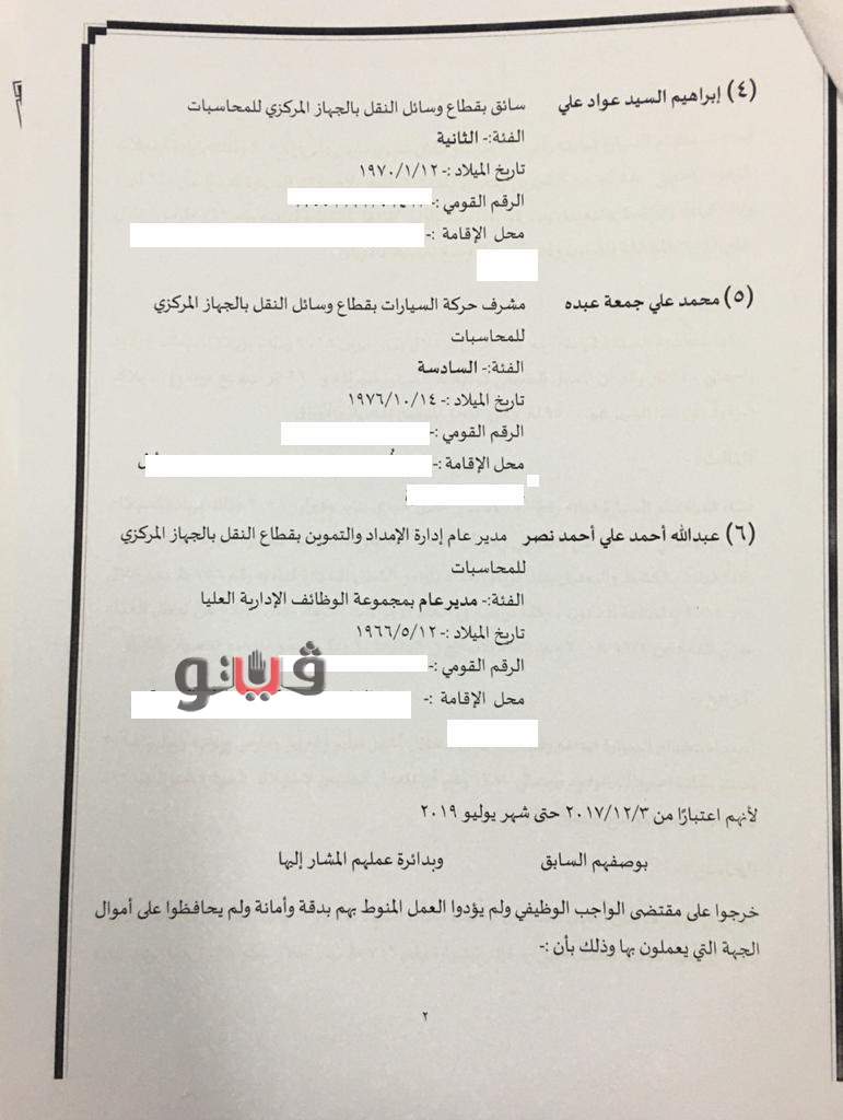وتبين أن عبد الله أحمد علي، مدير عام إدارة الإمداد والتموين بقطاع وسائل النقل بالجهاز المركزي للمحاسبات صرف 360 لتر سولار للسيارة 758 ط ب ر، خلال شهري يناير وفبراير 2018، و 480 لتر للسيارة 762 ط ب ر، شهري مارس وإبريل 2018 بزيادة عن المعدل الطبيعي لهم وهو 240 لتر شهريًا، كما صرف 240 لتر للسيارة 234 ف ن د، شهر إبريل 2018 بالزيادة عن معدل الإستهلاك وهو 960 لتر شهريًا، وصرف 1780 لتر سولار للسيارة رقم 129 ف ن د، عن أشهر يناير وفبراير ومارس ويونية ويوليو 2019، بالزيادة عن معدل الإستهلاك الطبيعي لها وهو 662 لتر، دون سند للصرف بالزيادة، وذلك بالمخالفة للقانون.