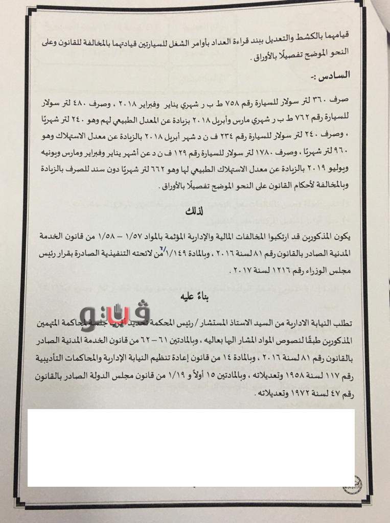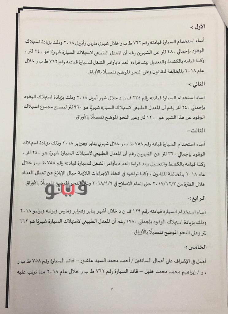 وأساء أحمد محمد السيد، السائق بالجهاز إستخدام السيارة قيادته رقم 758 ف ن د، خلال شهري يناير وفبراير 2018، وذلك بزيادة إستهلاك الوقود بإجمالي 360 لتر عن الشهرين رغم أن المعدل الطبيعي لإستهلاك السيارة شهريًا هو 240 لتر، وكذا قيامه بالكشط والتعديل ببند قراءة العداد بأوامر الشغل للسيارة قيادته بالمخالفة للقانون، وتراخى في إتخاذ الإجراءات اللازمة حيال الإبلاغ عن تعطل العداد لمدة عشرة أشهر حتى إتمام الإصلاح.