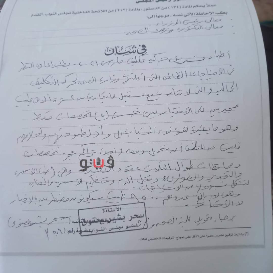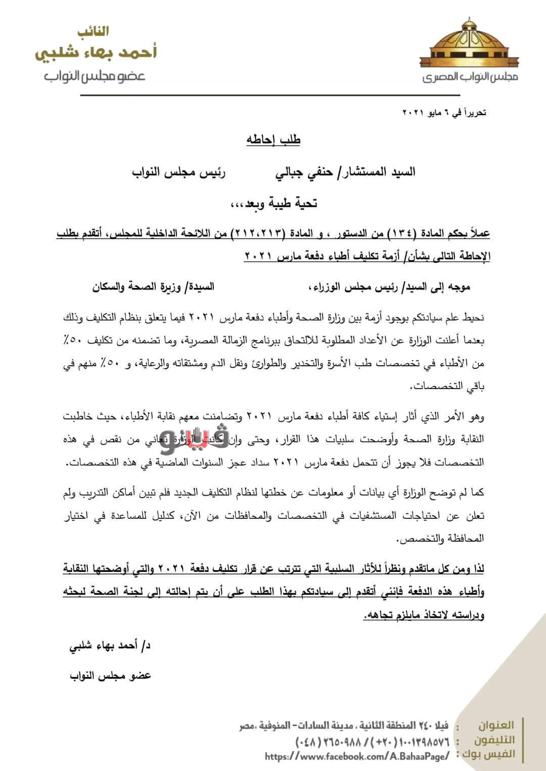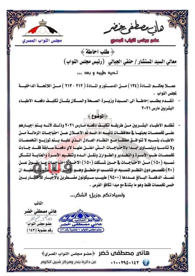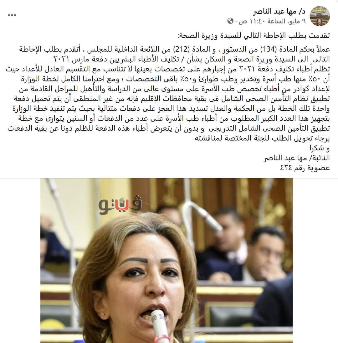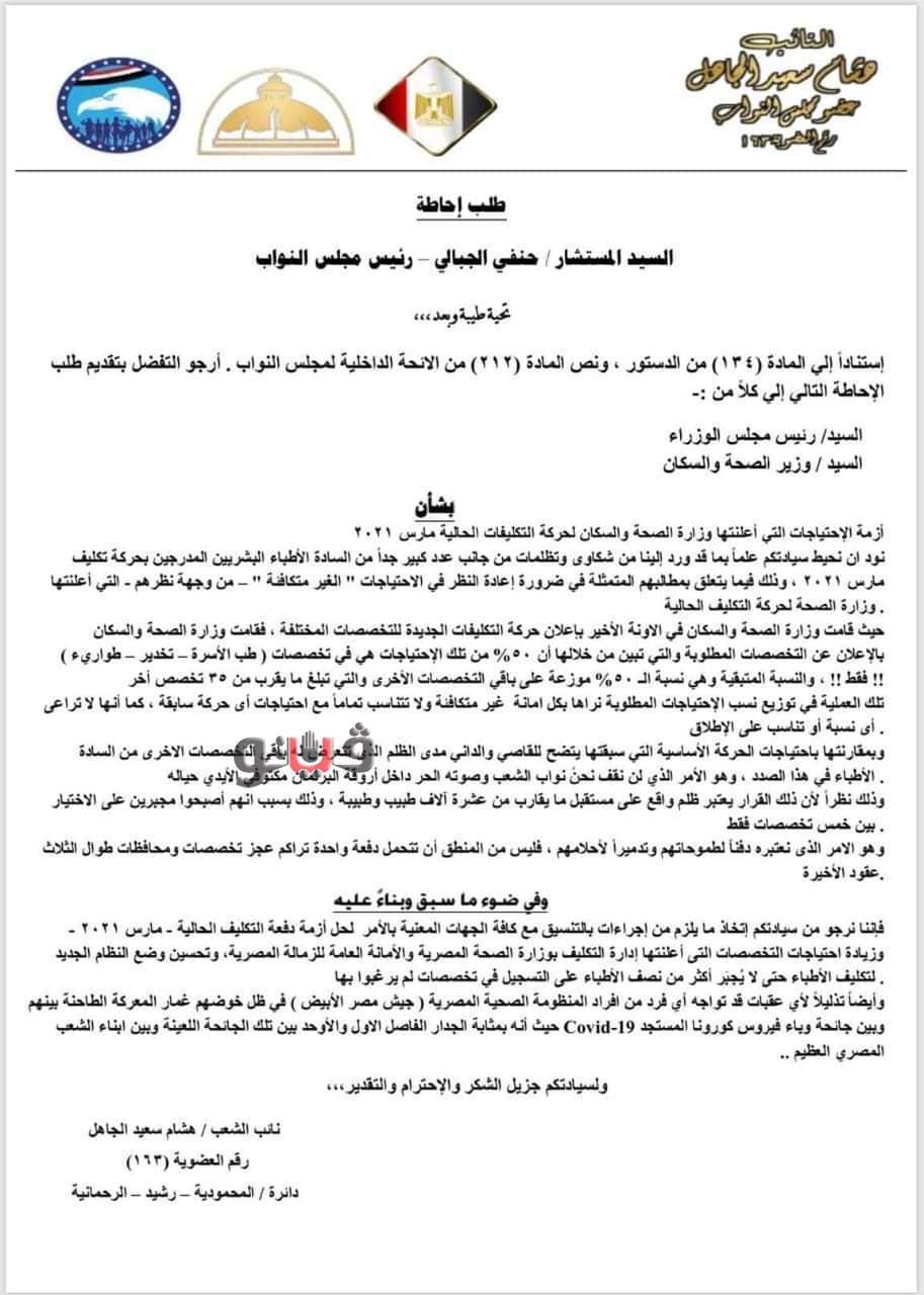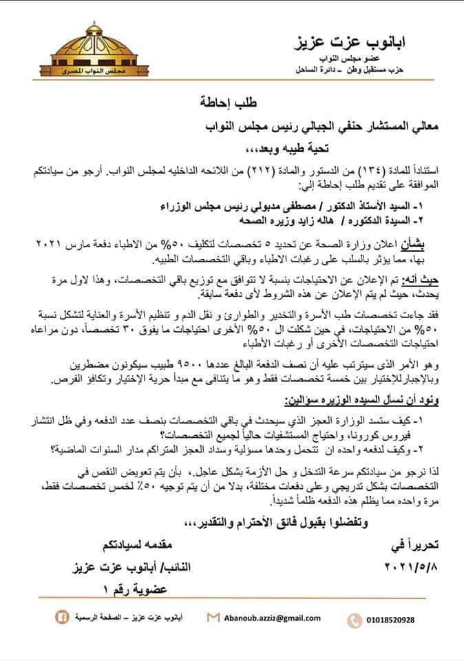 وجاء فى طلبات الإحاطة أنه عملاً بحكم المادة 134 من الدستور والمادة 212 من اللائحة الداخلية للمجلس نتقدم بطلب الإحاطة الى السيدة وزيرة الصحة والسكان بشأن تكليف الأطباء دفعة مارس 2021 وتظلم الأطباء من إجبارهم على تخصصات بعينها لا تتناسب مع التقسيم العادل للأعداد حيث أن 50 % منهم طب أسرة وتخدير وطب طوارىء و50% لباقى االتخصصا، وهومايعتبر دفناً لطموحات واحلام الأطباء بتحميل دفعة واحدة تراكم عجز تخصصات ومحافظات طوال الثلاث عقود الأخيرة