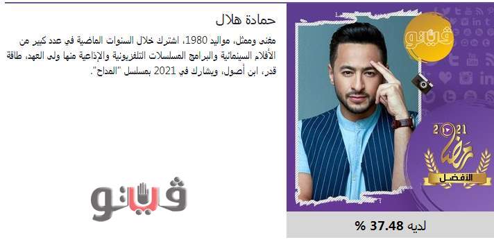 حصل النجم "حمادة هلال" على لقب أفضل ممثل في استفتاء "فيتو" لاختيار "الأفضل فى رمضان 2021".