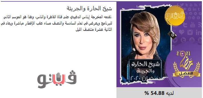 حصل برنامج "شيخ الحارة والجريئة" على لقب أفضل برنامج حواري فى استفتاء "فيتو" لاختيار "الأفضل فى رمضان 2021".