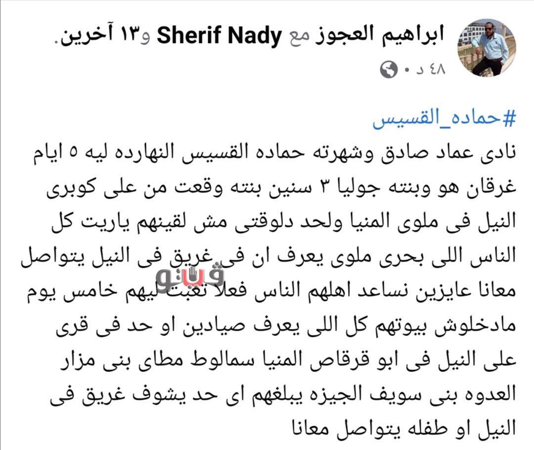 «نادى عماد صادق وشهرته حماده القسيس النهارده ليه ٥ ايام غرقان هو وبنته جوليا ٣ سنين بنته وقعت من على كوبرى النيل فى ملوى المنيا ولحد دلوقتى مش لقينهم ياريت كل الناس اللى بحرى ملوى يعرف ان فى غريق فى النيل يتواصل معانا عايزين نساعد اهلهم الناس فعلا تعبت ليهم خامس يوم مادخلوش بيوتهم كل اللى يعرف صيادين او حد فى قرى على النيل فى ابو قرقاص المنيا سمالوط مطاى بنى مزار العدوه بنى سويف الجيزه يبلغهم اى حد يشوف غريق فى النيل او طفله يتواصل معانا».