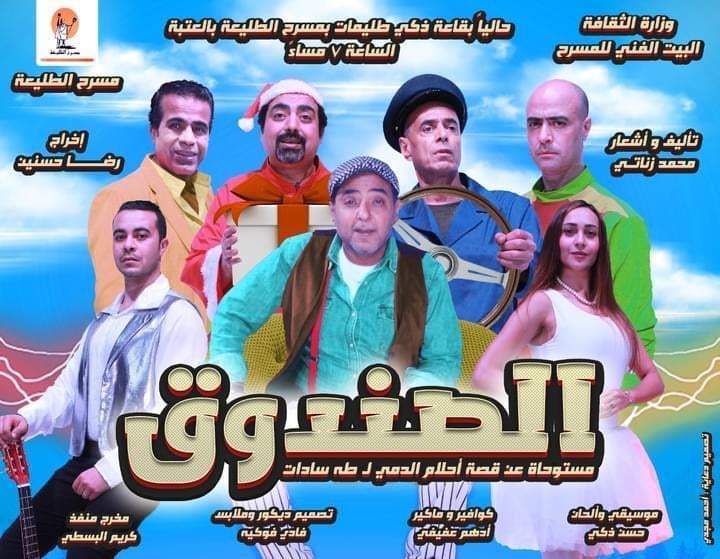 مسرحية الصندوق عن قصة أحلام الدمي لطه سادات، تأليف وأشعار محمد زناتي، تمثيل ياسر الطوبجي، ناصر شاهين، طه خليفة، أميرة عبد الرحمن، أحمد عبد الحي، محمد عبد الخالق، محمود فتحي، ديكور وملابس فادي فوكيه، موسيقي وألحان حسن زكي، ومن إخراج رضا حسنين.