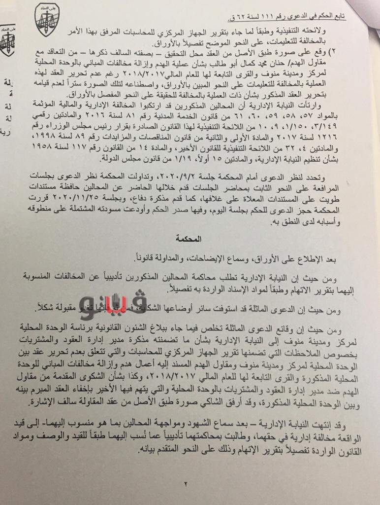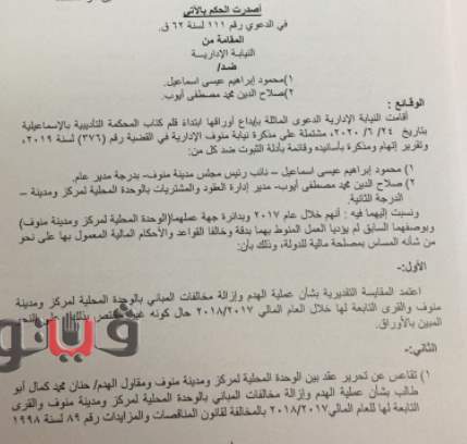أصدرت المحكمة التأديبية العليا بمجلس الدولة في القضية رقم 111 لسنة 62 قضائية عليا ببراءة نائب رئيس مجلس مدينة منوف و مدير إدارة العقود والمشتريات بالوحدة المحلية لمركز ومدينة منوف بعد ثبوت عدم إرتكابهما مخالفات مالية وإدارية وقصور التحقيقات