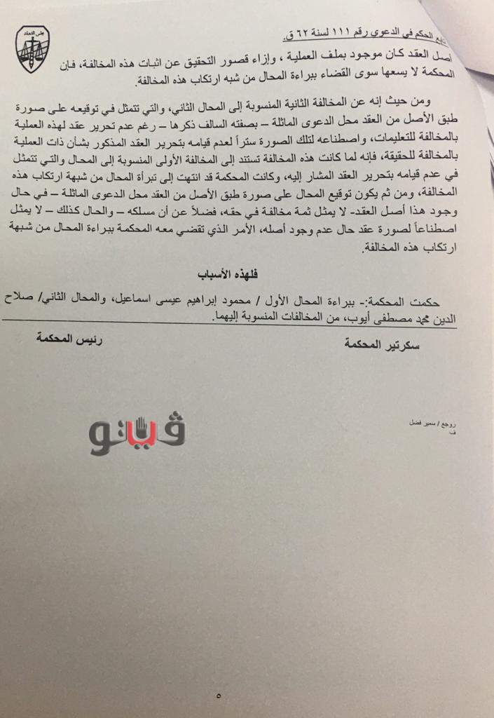 ولذلك قضت المحكمة ببراءة المحال الأول محمود إبراهيم عيسى والمحال الثاني صلاح الدين محمد مصطفى أيوب, من المخالفات المنسوبة إليهما
