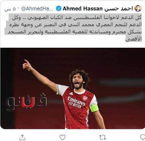وشارك أحمد حسن، نجم المنتخب المصري السابق وعميد لاعبي العالم في الهاشتاج قائلا: «كل الدعم لإخواننا الفلسطينيين ضد الكيان الصهيوني.. وكل الدعم للنجم محمد النني في التعبير عن وجهة نظره بشكل محترم ومساندته القضية الفلسطينية وتحرير المسجد الأقصى».