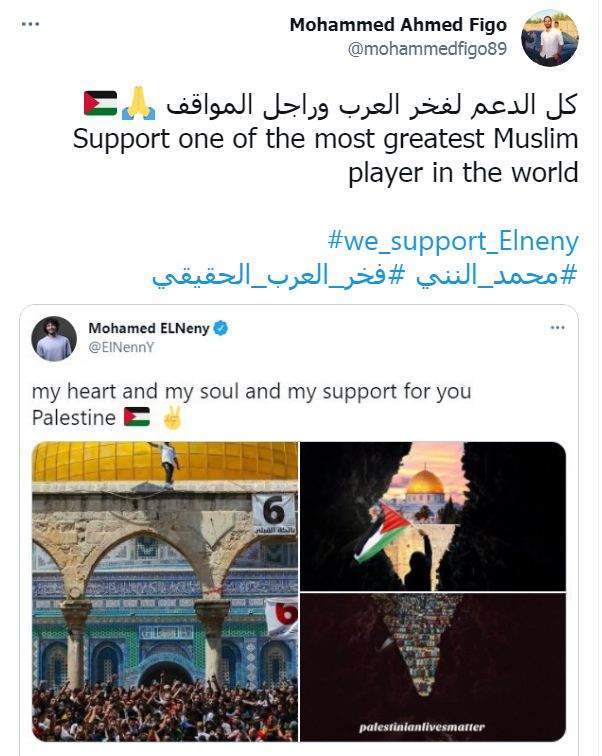 وفي سياق متصل، يواجه محمد النني لاعب منتخبنا الوطني وفريق أرسنال هجوما عنيفا وحملات يهودية تطالب بوقفه بسبب دعمه القضية الفلسطينية.