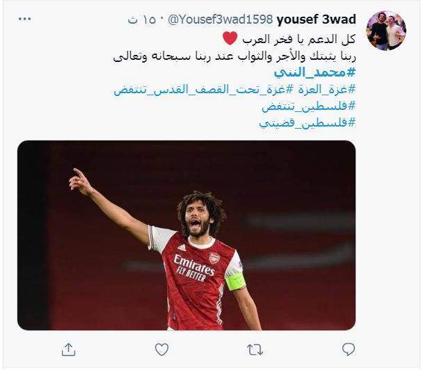 دشن نشطاء مواقع التواصل الاجتماعي تويتر، هاشتاجا جديدا بعنوان #فخر_العرب_الحقيقي، لدعم اللاعب محمد النني المحترف في صفوف نادي أرسنال الإنجليزي بعد تضامنه مع فلسطين.