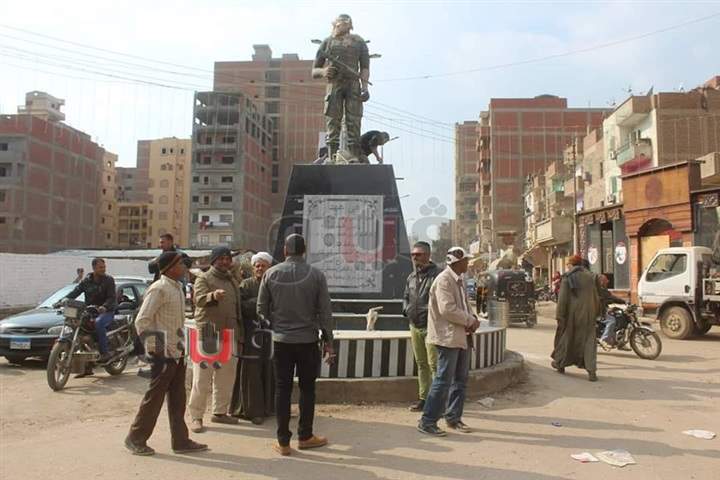أبناء الشهيد المنسي يلتقطون صورا مع مجسم والدهم بـ"حديقة" منيا القمح
