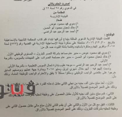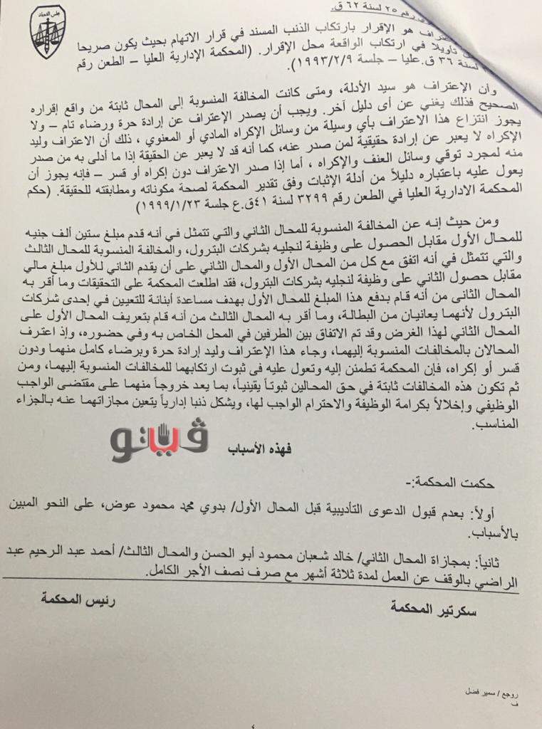 وأضافت المحكمة إن وقائع القضية بدأت بشكوى الشقيقان مصطفى خالد شعبان وأحمد خالد شعبان، المقدمتين للنيابة الإدارية ضد المحال الأول بدوي محمد محمود لحصوله على مبلغ ثلاثين ألف جنيه من كل منهما نظير الوعد بتعيينهما بإحدى شركات البترول حيث كان ذلك بناءً على إرشاد المحال الثالث أحمد عبد الرحيم عبد الراضي لوالد الشاكيين "المحال الثاني" خالد شعبان محمود الذي حضر الاتفاق في هذا الشأن داخل المحل الخاص بالمحال الثالث, وقد إنتهت النيابة الإدارية بعد سماع الشهود ومواجهة المحالين بما هو منسوب إليهم إلى قيد الواقعة مخالفة إدارية في حقهم، وطالبت بمحاكمتهم تأديبيًا عما نُسب إليهم