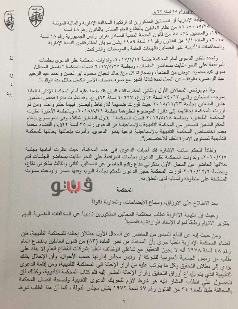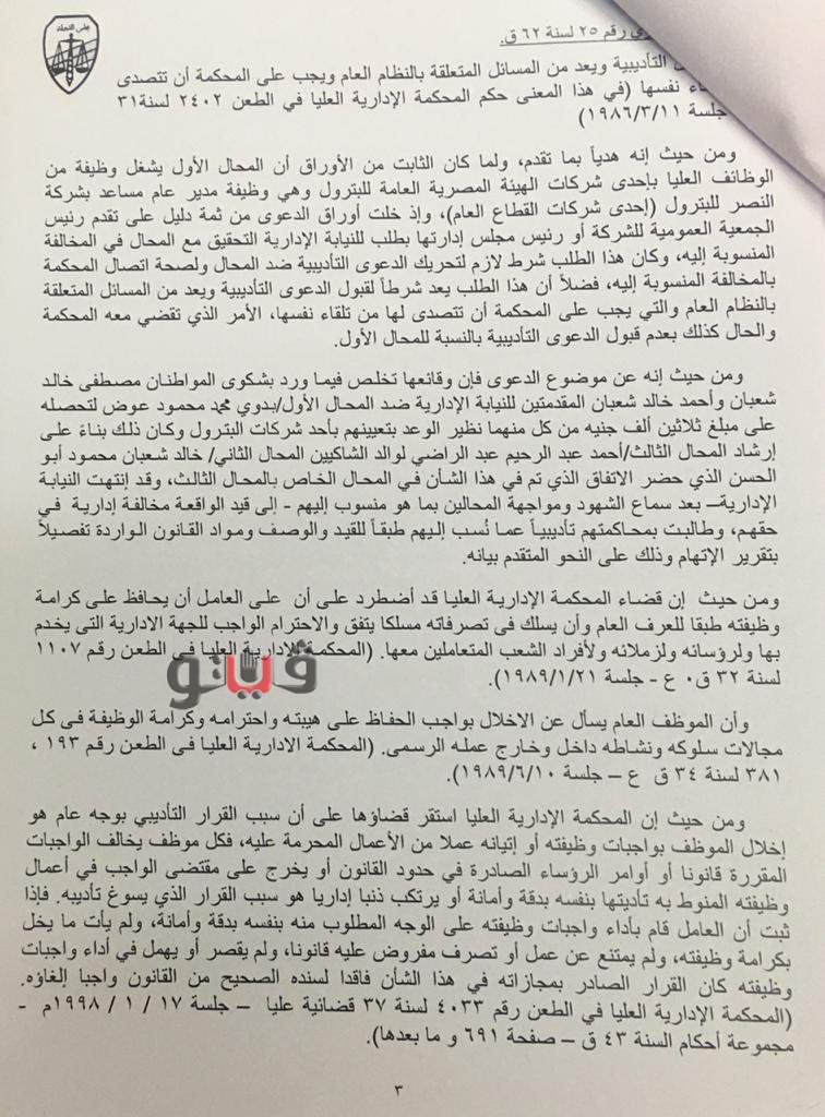 وأنتهت المحكمة التأديبية العليا إلى عدم قبول الدعوى التأديبية قبل المحال الأول بدوي محمد محمود, ومجازاة المحال الثاني خالد شعبان محمود والمحال الثالث أحمد عبد الرحيم عبد الراضي بالوقف عن العمل لمدة ثلاثة أشهر مع صرف نصف الأجر الكامل