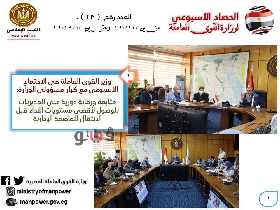 شهد حصاد الأسبوع الحالي، في وزارة القوى العاملة العديد من الأحداث المهمة خلال الفترة - من 7 مايو إلى 14 مايو الجاري- منها إجتماع هام مع كبار مسؤولي الوزارة تمهيدا للانتقال للعاصمة الإدارية الجديدة .