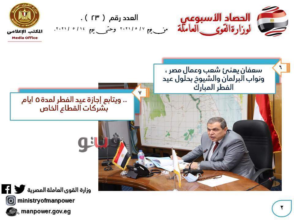 وأصدر وزير القوي العاملة توجيهاته لمديري مديريات القوى العاملة ومكاتبها بالمحافظات، لمتابعة تنفيذ إجازة عيد الفطر المبارك بالقطاع الخاص بالشركات والمصانع .