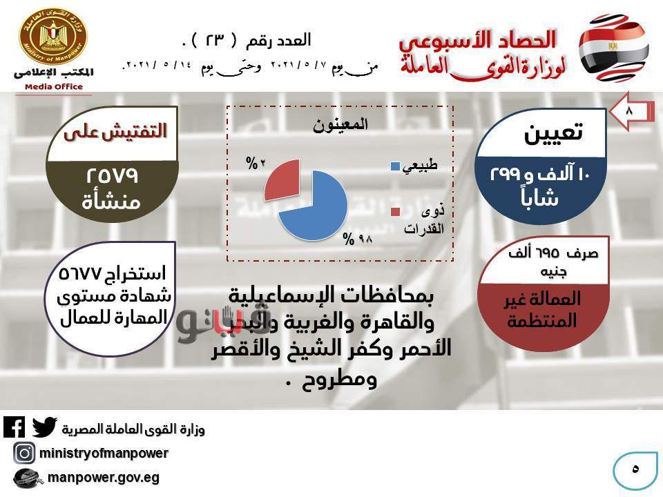 وعلي جانب آخر شمل حصاد الأسبوع تعيين 10 آلاف و 299 شابا في 7 محافظات ، وصرف منح للرعاية الاجتماعية والصحية للعمالة غير المنتظمة المسجلة بمديريات القوى العاملة بمحافظات الإسماعيلية ، والقاهرة ، والغربية ، والبحر الأحمر ، وكفر الشيخ ، والأقصر ، ومطروح بلغت 695 ألف جنيه ، والتفتيش على 2579 منشأة لتطبيق أحكام القانون، فضلاً عن إستخراج 5677 شهادة قياس مستوى المهارة ، ورخصة مزاولة الحرفة لـ 5677 عاملا.