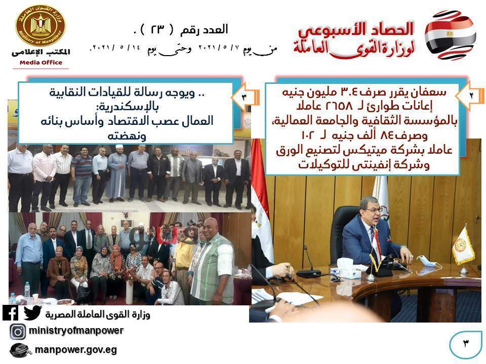 وشمل الحصاد ، موافقة وزير القوى العاملة ورئيس مجلس إدارة صندوق إعانات الطوارئ للعمال على صرف 3 ملايين و 473ألفاً و631 جنيهًا من الصندوق بالوزارة لـ 2658 عاملا بالمؤسسة الثقافية العمالية والجامعة العمالية ، نظرًا للظروف الاقتصادية التى تمر بها وفقًا للكشوف الواردة والمعتمدة من التأمينات.