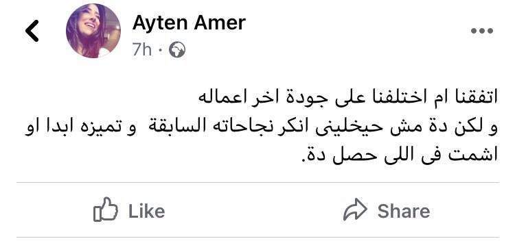 وكتبت "آيتن" عبر موقع فيس بوك : "اتفقنا أم اختلفنا على جودة آخر أعماله.. و لكن دة مش هيخلينى أنكر نجاحاته السابقة وتميزه أبدا أو أشمت فى اللى حصل دة".