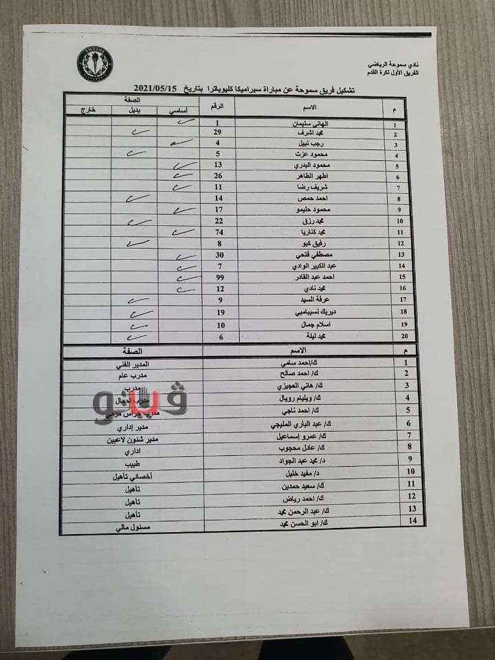 ويبدأ سيراميكا كليوباترا المباراة بتشكيل مكون من: