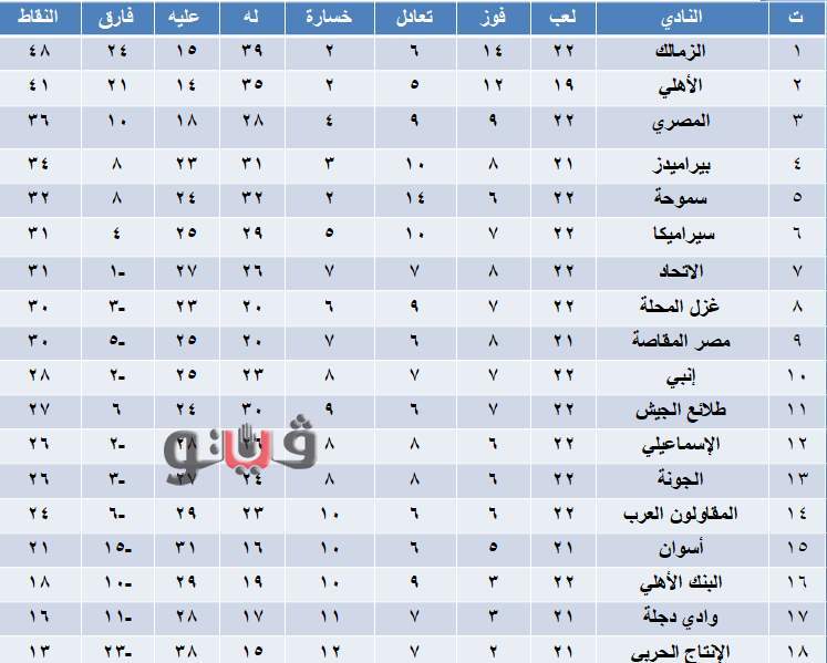 تنشر فيتو جدول ترتيب الدوري الممتاز بعدما أقيمت، اليوم السبت، ثلاث مباريات ضمن مواجهات الجولة الـ 22 لمسابقة الدوري المصري الممتاز.