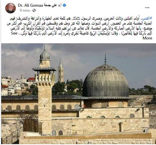 وكتب علي جمعة تدوينة على الفيس بوك قال فيها: "#القدس.. أولى القبلتين وثالث الحرمين، ومسرى الرسول ﷺ, هي كلمة تعني الطهارة والنزاهة والتشريف؛ فهي المدينة المقدسة على مر العصور, أرض النبوات, وصفها الله عز وجل هي وفلسطين في القرآن الكريم- في أكثر من موضع- بأنها الأرض المباركة والأرض المقدسة، قال تعالى عن إبراهيم عليه السلام: (وَنَجَّيْنَاهُ وَلُوطًا إِلَى الْأَرْضِ الَّتِي بَارَكْنَا فِيهَا لِلْعَالَمِينَ) ، وقال: (وَلِسُلَيْمَانَ الرِّيحَ عَاصِفَةً تَجْرِي بِأَمْرِهِ إِلَى الْأَرْضِ الَّتِي بَارَكْنَا فِيهَا وَكُنَّا بِكُلِّ شَيْءٍ عَالِمِينَ) ،وقال على لسان سيدنا موسى عليه السلام: (يَا قَوْمِ ادْخُلُوا الْأَرْضَ الْمُقَدَّسَةَ الَّتِي كَتَبَ اللَّهُ لَكُمْ وَلَا تَرْتَدُّوا عَلَى أَدْبَارِكُمْ فَتَنْقَلِبُوا خَاسِرِينَ) ، وقال تعالى: (سُبْحَانَ الَّذِي أَسْرَى بِعَبْدِهِ لَيْلًا مِنَ الْمَسْجِدِ الْحَرَامِ إِلَى الْمَسْجِدِ الْأَقْصَى الَّذِي بَارَكْنَا حَوْلَهُ لِنُرِيَهُ مِنْ آيَاتِنَا إِنَّهُ هُوَ السَّمِيعُ الْبَصِيرُ).