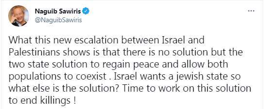 وكتب نجيب ساويرس تغريدة على تويتر قال فيها: "التصعيد الجديد بين إسرائيل والفلسطينيين يظهر أنه لا يوجد حل سوى حل الدولتين لاستعادة السلام والسماح لكلا الشعبين بالتعايش. اسرائيل تريد دولة يهودية فما الحل أيضًا؟ حان الوقت للعمل على هذا الحل لإنهاء القتل!".