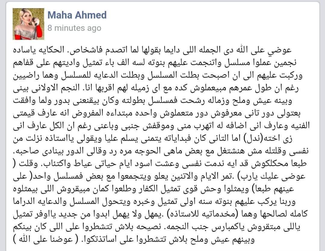 وأختتمت مها أحمد بـ : "قلت ( عوضى عليك يارب) .تمر الايام والاتنين يعلو ويتجمعوا مع بعض في مسلسل واحد( على عينهم طبعا) ويمثلوا وحش قوى تمثيل الكفار وطلعوا كمان مبيقروش اللى بيمثلوه وربنا يركب عليهم بنوته سنه اولى تمثيل وخبره ويتحول المسلسل والدعايه الدراما كامله لصالحها وهما (مخدماتيه للاستاذه) . يمهل ولا يهمل ابدوا من جديد يا اوفر تمثيل ياللى مبتقروش ياكمبارس جنب النجمه. نصيحه بلاش تتشطروا على اللى كان بينكم وبينهم عيش وملح بلاش تتشطروا على اساتذتكوا... يارب متحوجنا لحد حتى ولو كان اققرب الناس لينا".