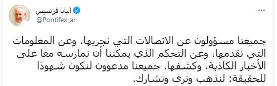 وكتب بابا الفاتيكان تغريدة على تويتر "جميعنا مسؤولون عن الاتصالات التي نجريها، وعن المعلومات التي نقدمها، وعن التحكم الذي يمكننا أن نمارسه معًا على الأخبار الكاذبة، وكشفها. جميعنا مدعوون لنكون شهودًا للحقيقة: لنذهب ونرى ونشارك"