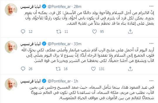 قال البابا فرنسيس بابا الفاتيكان، إنه يصلى من أجل آلام شعب ميانمار، مؤكدًا أنه لكي يحول الله قلوب الجميع إلى السلام يجب ألا يفقدوا الرجاء أبدًا؛ وأن الالتزام من أجل السلام والأخوة يولد دائمًا من الأسفل، وكل فرد يمكنه أن يقوم بدوره.