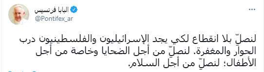 كتب البابا فرنسيس بابا الفاتيكان تغريدة على تويتر "لنصلِّ بلا انقطاع لكي يجد الإسرائيليون والفلسطينيون درب الحوار والمغفرة لنصلِ من أجل الضحايا وخاصة من أجل الأطفال؛ لنصلِّمن أجل السلام"