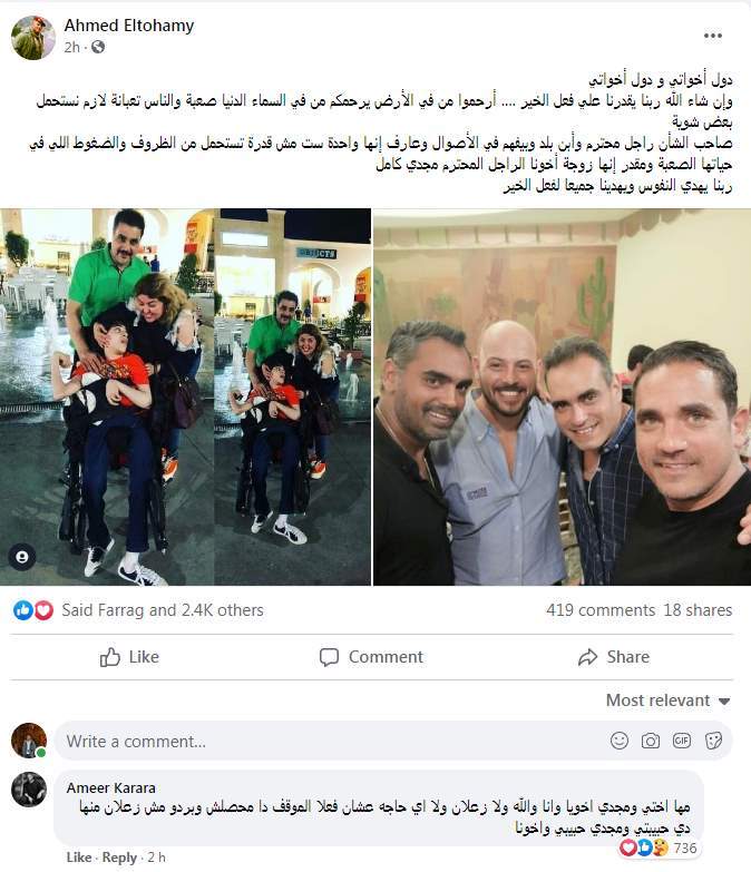 منشور الفنان أحمد التهامي والذي حاول من خلاله إنهاء الخلاف بين أمير كرارة ومها أحمد بعد تصريحاتها المثيرة التي أطلقها مؤخرا.