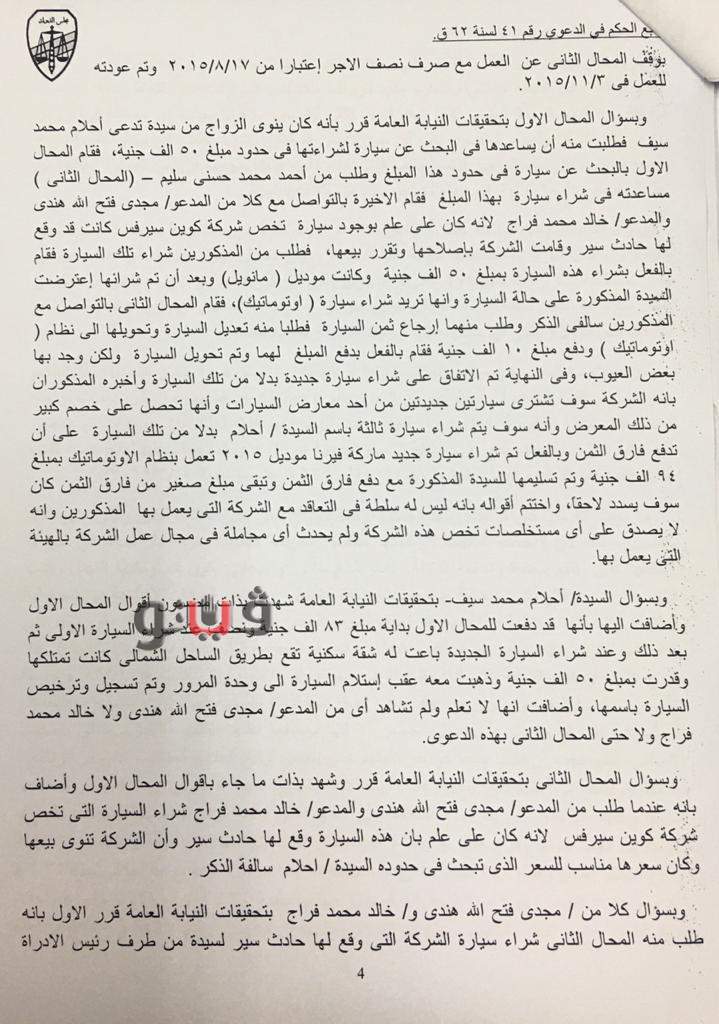 وبسؤال المحال الثاني بتحقيقات النيابة العامة قرر بذات ما جاء بأقوال المحال الأول وأضاف بأنه عندما طلب من مجدى فتح الله هندي وخالد محمد فراج شراء السيارة التي تخص شركة كوين سيرفس لأنه كان على علم بأن هذه السيارة وقع لها حادث سير وأن الشركة تنوي بيعها وكان سعرها مناسب للسعر الذى تبحث فى حدوده السيدة (أ).