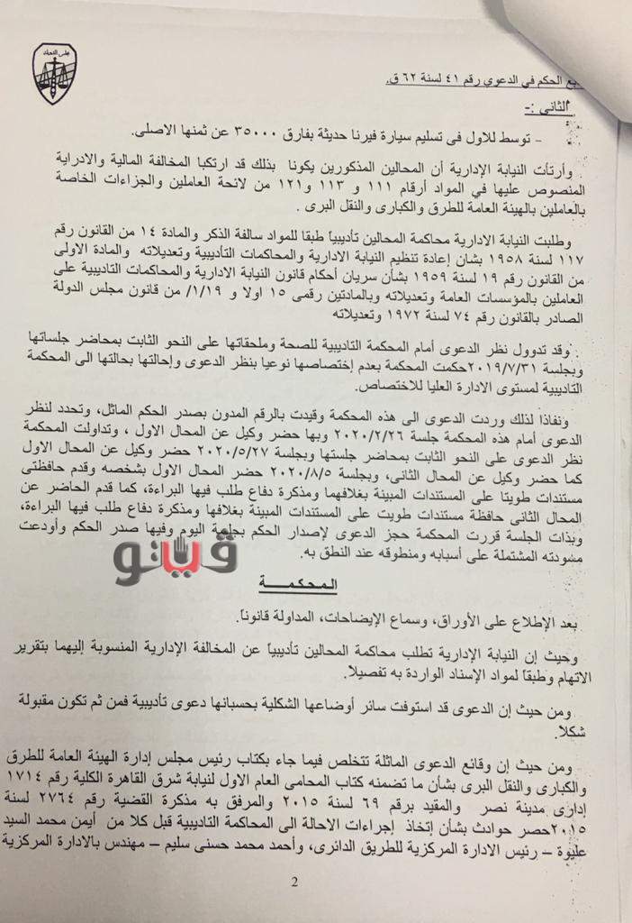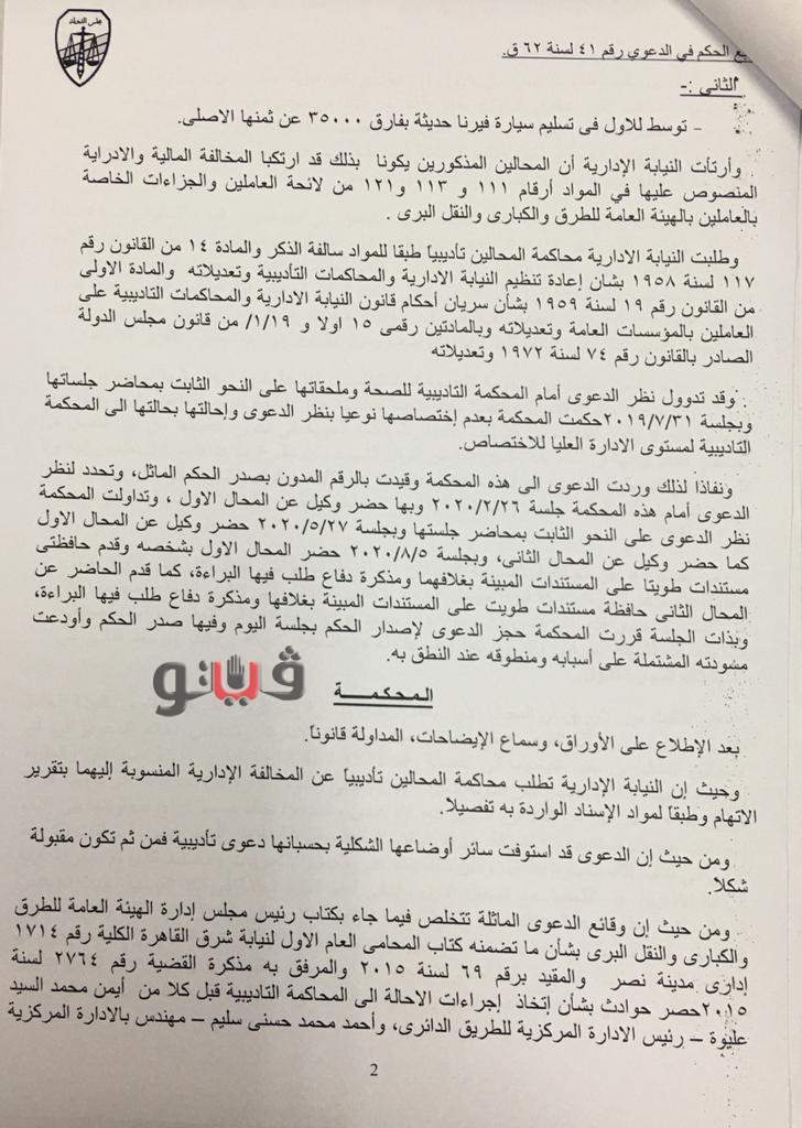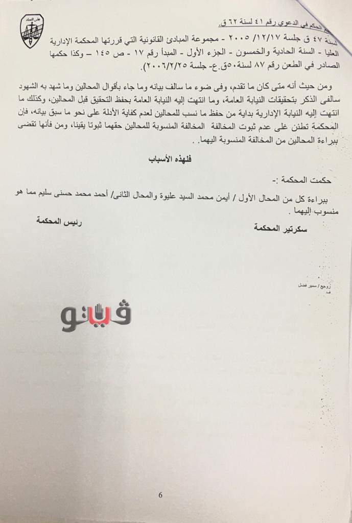 ولأن الحق أحق أن يُتبع.. ولأن ثوب قضاء مجلس الدولة الشامخ ناصع البياض لا يعرف المواربة فقد صدر حكم المحكمة التأديبية في القضية 41 لسنة 62 قضائية مرصعًا بالذهب متضمنًا في ضوء ما سلف بيانه وما جاء بأقوال المحالين والشهود بتحقيقات النيابة العامة، وما انتهت إليه بحفظ التحقيق، وكذلك ما انتهت إليه النيابة الإدارية للنقل بداية من حفظ ما نسب للمحالين لعدم كفاية الأدلة، فإن المحكمة تطمئن على عدم ثبوت المخالفة المنسوبة للمحالين ثبوتا يقينا، وقضت ببراءتهما.