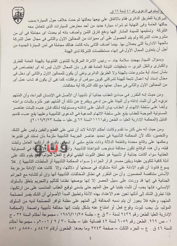 قالت المحكمة التأديبية عبر حيثيات حكمها إن المحالين سبق اتهامهما عبر تحقيقات نيابة أمن الدولة العليا، بتلقي الأول رشوة عبارة عن سيارة ملاكي مقابل إنهاء إجراءات صرف مستخلصات لشركة كوين سيرفس، وتوسط الثاني في تسليم تلك السيارة للأول، وكان ذلك بناء على محضر التحريات والضبط الذي تم بمعرفة الرقابة الإدارية، وتم التحقيق مع المحالين أمام النيابة العامة، حيث تم حبس المحال الاول على ذمة التحقيقات لمدة 93 يومًا.