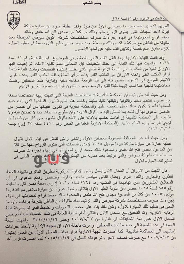 وبعد الشراء اعترضت المذكورة على حالة السيارة وأنها تريد شراء سيارة (أوتوماتيك)، فقام المحال الثاني بالتواصل مع المذكورين وطلب منهما إرجاع ثمن السيارة فطلبا منه تعديل السيارة وتحويلها إلى نظام (أوتوماتيك) ودفع مبلغ 10 آلاف جنيه، فقام بالفعل بدفع المبلغ لهما وتم تحويل السيارة، ولكن وجد بها بعض العيوب، وفي النهاية تم الاتفاق على شراء سيارة جديدة بدلا من تلك السيارة وأخبره المذكوران بأن الشركة سوف تشتري سيارتين جديدتين من أحد معارض السيارات وأنها تحصل على خصم كبير من ذلك المعرض وأنه سوف يتم شراء سيارة ثالثة باسم السيدة (أ) بدلا من تلك السيارة على أن تدفع فارق الثمن.