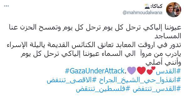 وتنوعت تغريدات المدونين من خلال الهاشتاج، على مؤازرة الشعب الفلسطيني ودعم قضيتهم، والدعاء لهم، مستعرضين أهم أحداث العدوان الإسرائيلي على الشعب الفلسطينى الأعزل خاصة استشهاد الأطفال، وتنديدات بمقاطعة المنتجات الإسرائيلية.