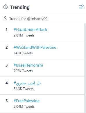 سيطرت أحداث العدوان الإسرائيلي على قطاع غزة والأراضي الفلسطينية، على قائمة ترندات مواقع التواصل الاجتماعي تويتر والفيس بوك في مصر، حيث جاءت قائمة الترند بترتيب الهاشتاجات الداعمة للقضية الفلسطينية، #GazaUnderAttack، #WeStandWithPalestine، #IsraeliTerrorism، #تل_ابيب_تحترق، #فلسطين_تنتقض.