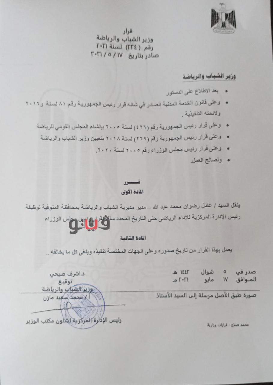 وكان عادل رضوان شغل المنصب منتدبا من منصبه كمدير لمديرية الشباب والرياضة، قبل أن يتم نقله رسميا لتولي الإدارة المركزية للأداء الرياضي ونقله إلى الدرجة العليا.