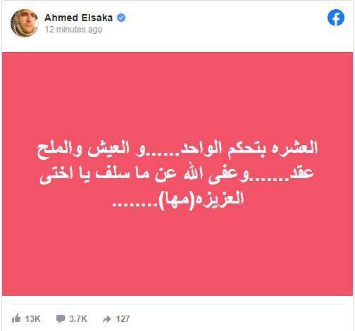 وكتب أحمد السقا عبر صفحته: "العشره بتحكم الواحد......و العيش والملح عقد.......وعفى الله عن ما سلف يا اختي العزيزة (مها)".