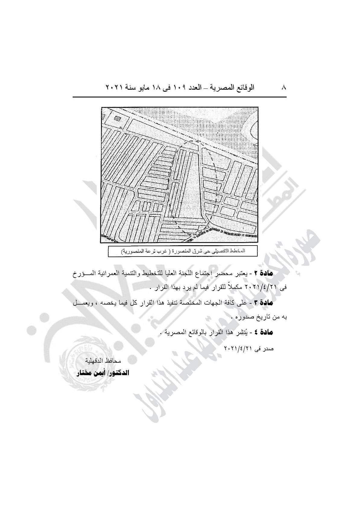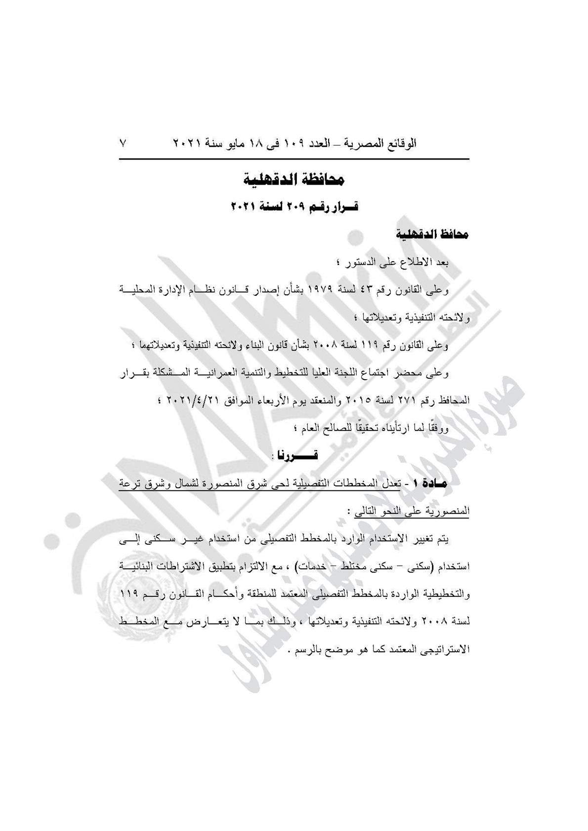 نشرت جريدة الوقائع المصرية في عددها رقم 109، الصادر في 18 مايو 2021، قرار محافظة الدقهلية رقم 209 لسنة 2021، بشأن تعديل المخططات التفصيلية لحي شرق المنصورة لشمال وشرق ترعة المنصورة.