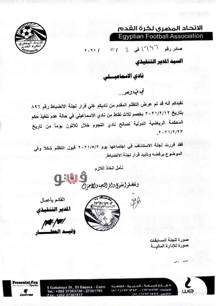 وكانت لجنة الإستئناف بالاتحاد المصري لكرة القدم قررت خصم ثلاث نقاط من النادي الإسماعيلي في حالة عدم تنفيذ حكم المحكمة الرياضية الدولية "كاس" لصالح نادي النجوم لكرة القدم خلال 30 يوماً من تاريخ 23 فبراير 2021.