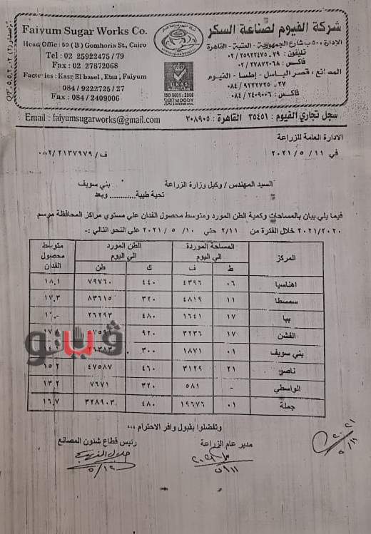 19 ألف و676 فدانًا، لمصنع شركة الفيوم لصناعة السكر، منذ بداية موسم التوريد في