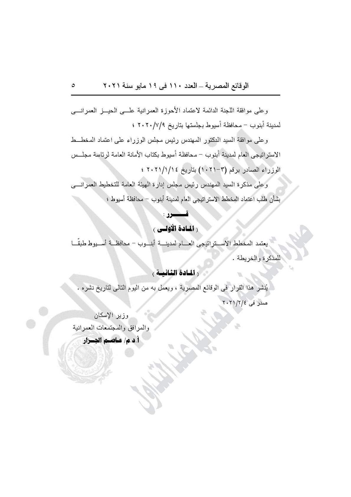 نشرت جريدة الوقائع المصرية في عددها رقم 110، الصادر في 19 مايو 2021، قرارى وزارة الإسكان والمرافق والمجتمعات العمرانية، بشأن اعتماد المخطط الاستراتيجي العام لمدينتي أبنوب بأسيوط وقها في القليوبية.